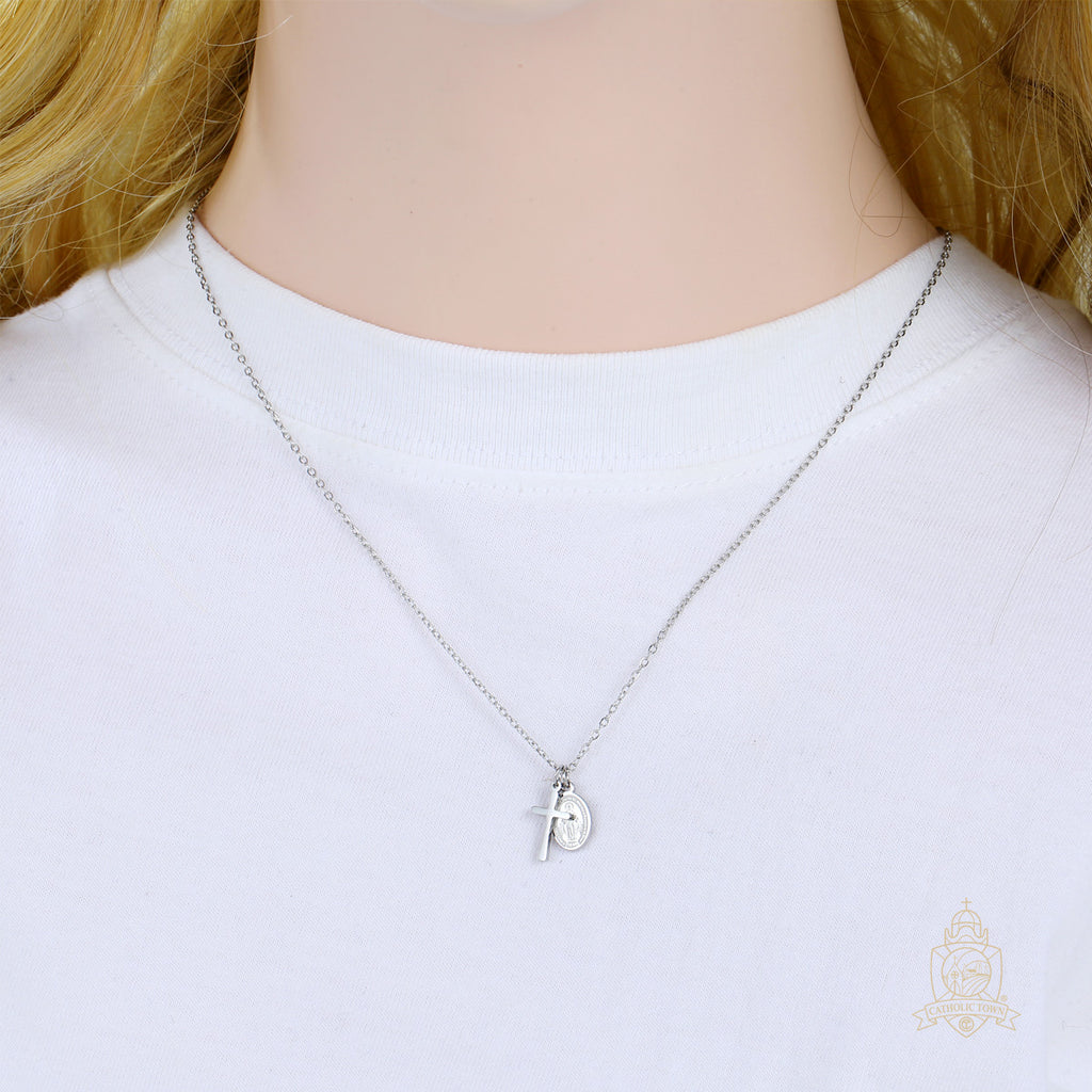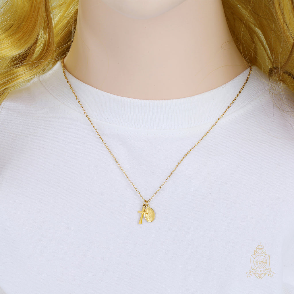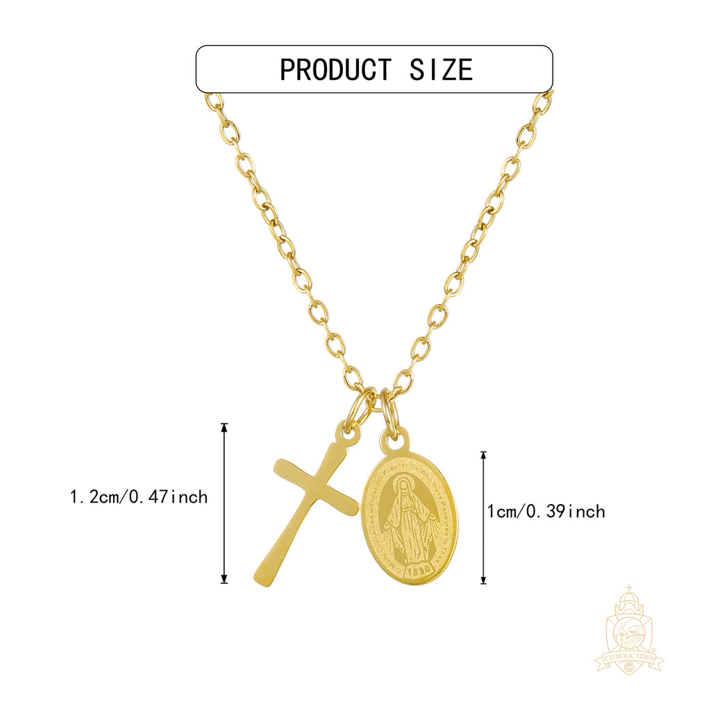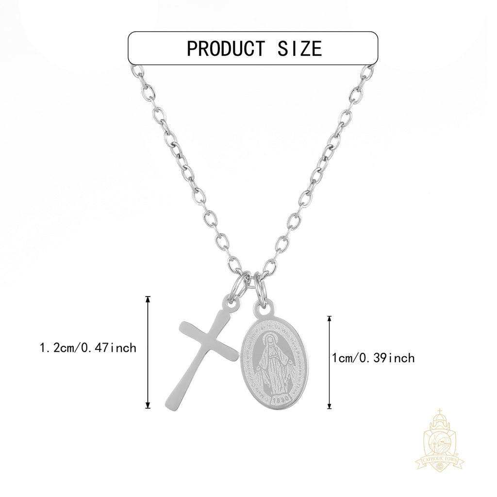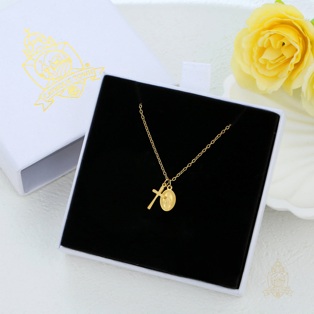 Carry your faith close to your heart with this beautifully designed Cross and Miraculous Medal Necklace. This meaningful two-charm pendant combines a minimalist cross with the powerful Miraculous Medal of the Blessed Virgin Mary, a cherished Catholic devotion associated with protection, grace, and intercession.