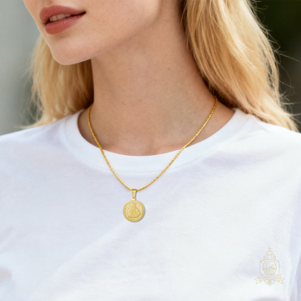 Designed with a radiant lattice-style background and sunburst border, this medal blends spiritual meaning with timeless elegance. The pendant hangs from a classic matching chain, making it suitable for daily wear, prayer, Mass, or special religious occasions.