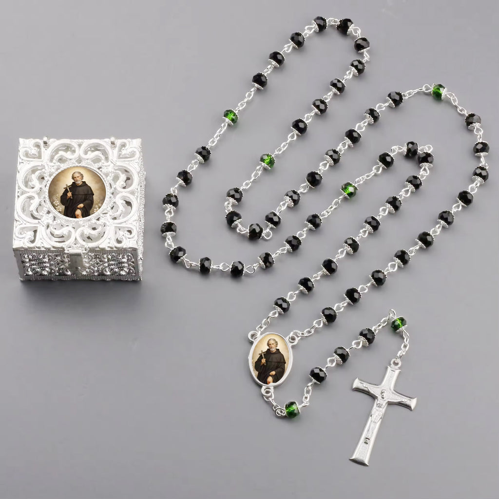 The rosary comes in an ornate silver metal keepsake case, engraved with decorative patterns and featuring an image of St. Peregrine on the lid. This case protects the rosary and makes it a meaningful Catholic gift for anyone seeking comfort, healing, and spiritual strength.